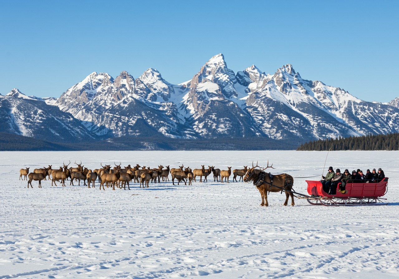 As you explore Jackson Hole, you'll quickly notice the expansive Elk Refuge just beyond the town limits. This vast area serves as a winter sanctuary for thousands of elk. Amidst the refuge, the elk roam and rest majestically, creating a breathtaking sight. To witness them up close, there's only one option: a sleigh ride. Visitors are whisked away in horse-drawn sleighs for an intimate encounter with these magnificent creatures in their natural habitat. For further details on sleigh rides and booking information, click here.
